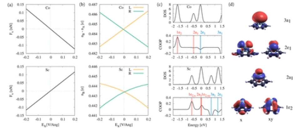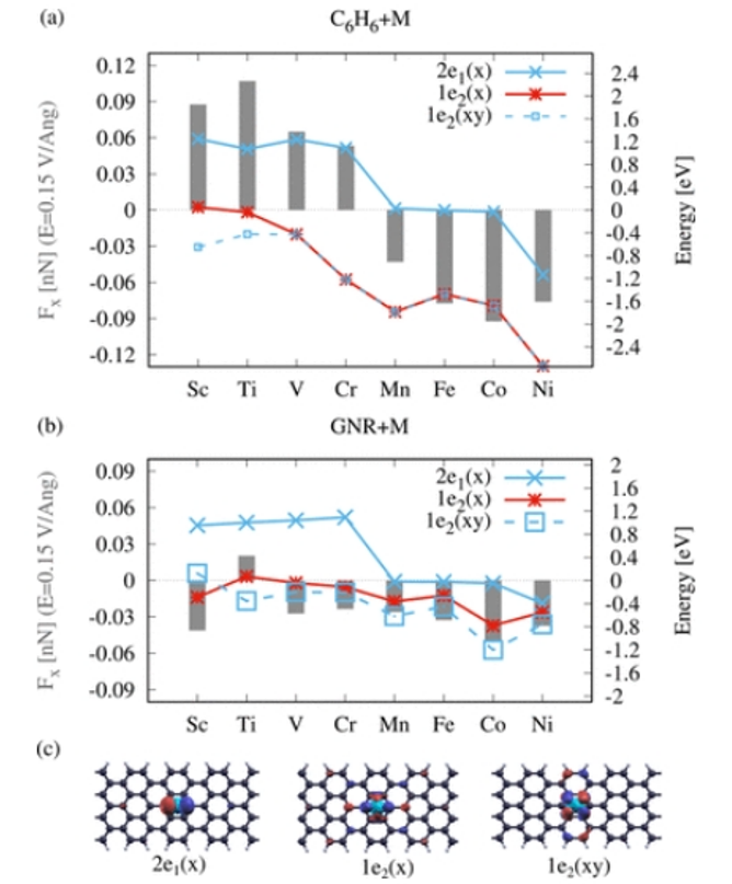 x中7-aGNR上的Co原子上的電遷移力,取決于摻雜水平和原子位置。(a) 在n-、p-和未摻雜的7-aGNR上的Co原子上的電場E