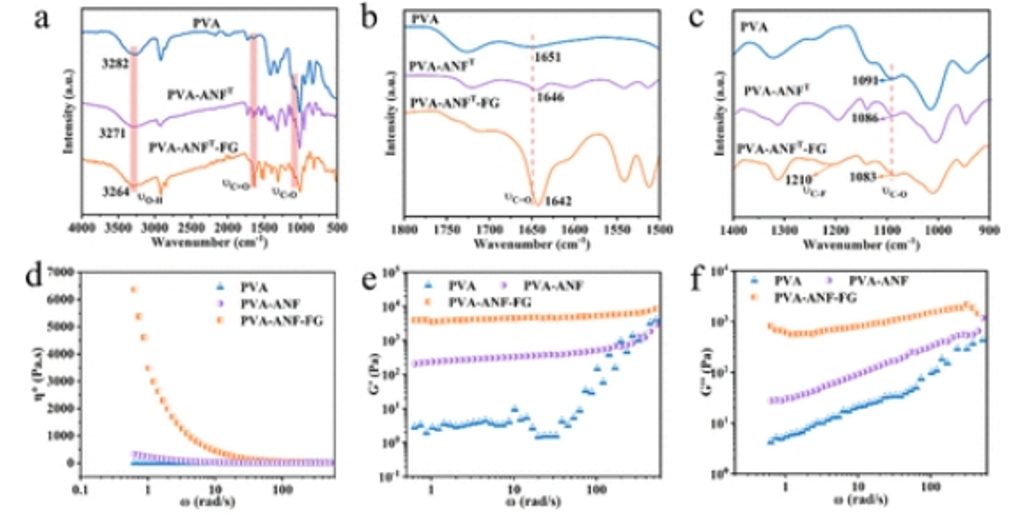 T的FTIR光譜。(d–f)PVA、PVA–ANF和PVA–ANF-FG溶液的復數粘度、儲能模量和損耗模量。