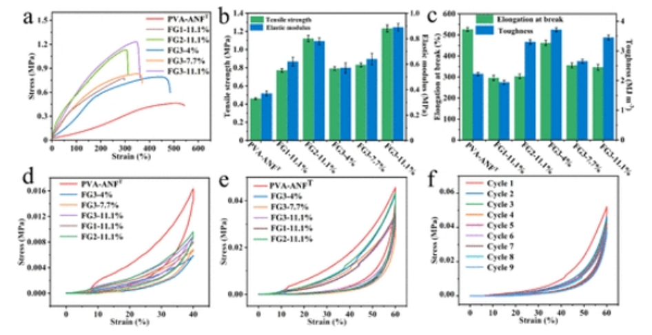 T與40%和60%的不同FG復合水凝膠的循環壓縮試驗。(f) 壓縮試驗涉及9個循環,使用60%的PVA–ANF–FG