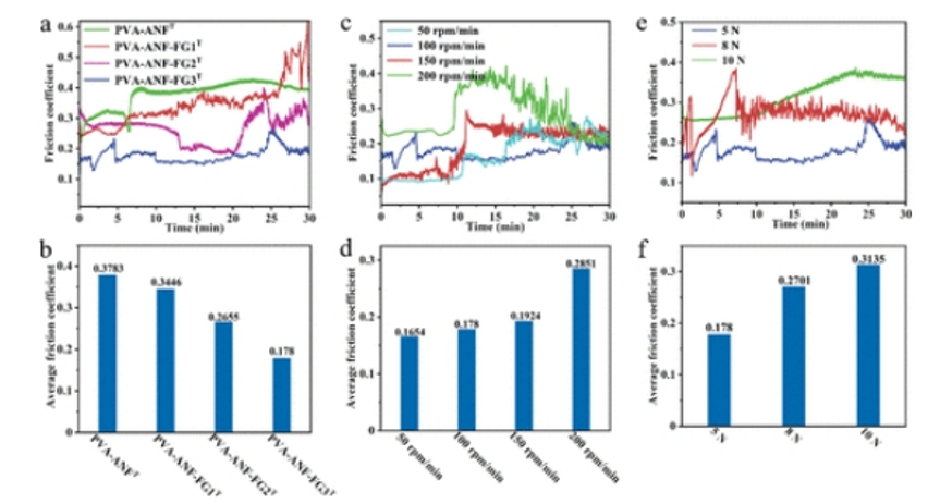 T-11.1%在不同轉速(載荷:5N)下的摩擦系數。(e,f)PVA–ANF–FG3