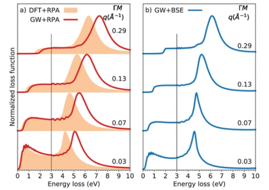 圖3. 在不同理論水平上計算的沿ΓM增加動量傳遞時獨立石墨烯的能量損失譜:DFT+RPA和GW+RPA(a);GW+BSE(b)。
