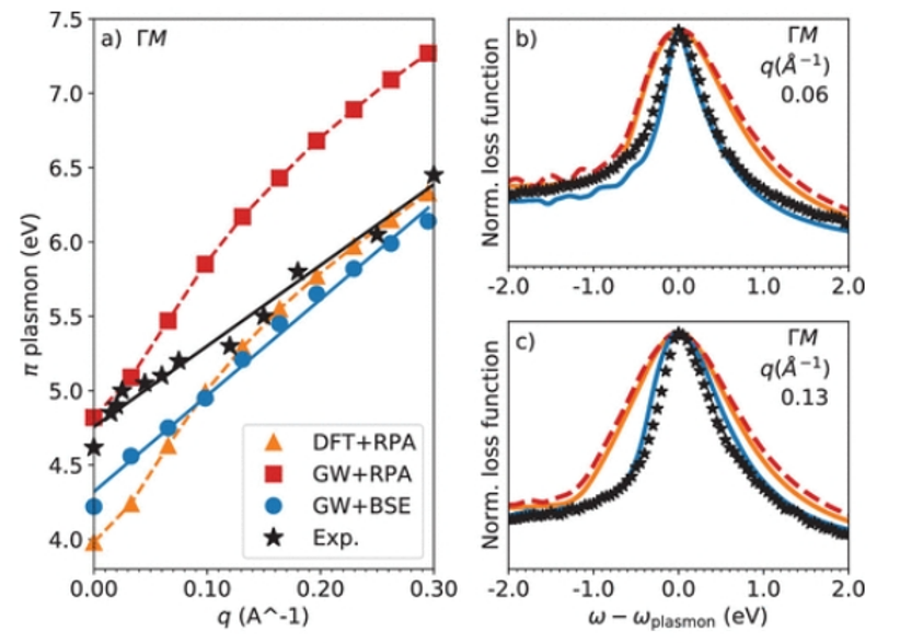圖4. (a) 通過支持信息中描述的程序獲得的π-等離子體色散。黑色(藍色)的直線是測量(計算)的等離子體色散的線性回歸。虛線是眼睛的向導。(b,c)在沿ΓM方向的不同動量轉移下,測量和計算的獨立石墨烯的π-等離子體激元峰:(b)q=0.06Å-1;(c) q=0.13Å–1。不同的顏色指的是計算中不同的理論水平:DFT+RPA(橙色線)、GW+RPA(紅色線)和GW+BSE(藍色線)。實驗數據顯示為黑色恒星。