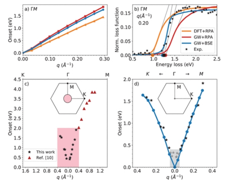 圖5. (a) 在不同理論水平上計算的獨立石墨烯沿ΓM方向的起始色散。(b) 實驗和計算的起始形狀為q≈0.2Å-1。灰線表示用于確定起點的半高切線。實心圓表示起始位置。(c) ΓK和ΓM方向上的q的測量原點。由于經驗的不確定性,尚未在ΓK方向上進行提取。ref(10)(q≤0.4)Å–1的起始不可及區域被染成紅色。它也顯示在石墨烯的第一個BZ內部。(d) 放大測量的起始分散度(黑色),并與計算的起始分散比較(藍色)。不可訪問范圍q≤0.05)Å–1被染成灰色,也顯示在第一個BZ中。石墨烯的第一個PZ上也繪制了相同的區域。q≤0.05Å-1范圍內的灰色數據點有很大的誤差,因為它們取決于ZLP的去除。