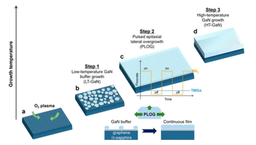 3的脈沖流下的脈沖外延橫向過度生長(PLOG)以在石墨烯上形成連續緩沖層,以及(d)在NH3的連續流下的高溫GaN(HT-GaN。