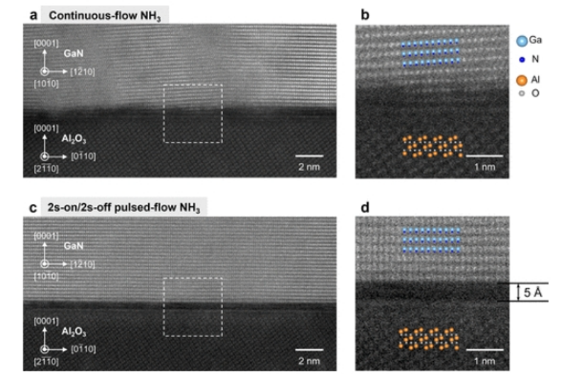 3生長的石墨烯涂覆的c-apphire襯底上的GaN薄膜的橫截面STEM圖像和(b)虛線框的放大圖像。(c) 在第二生長步驟中使用2s開/2s關脈沖流NH