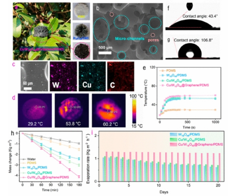 49@Graphene/PDMS體系的親水性表面和(g)疏水性內部。(h)不同系統在1太陽(1 kW m