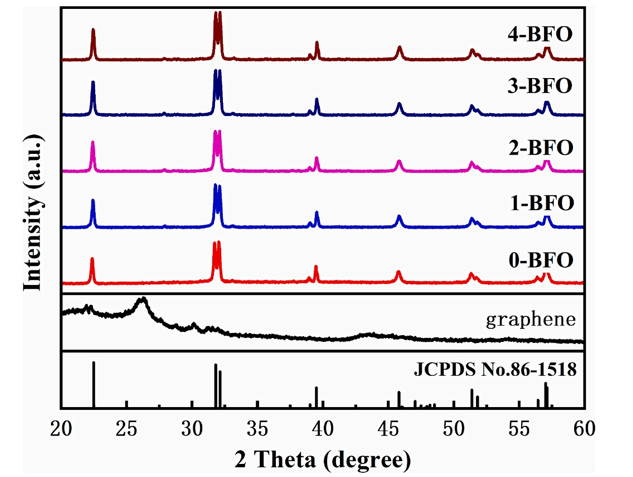 3復合材料,并對其超聲輔助活化過氧單硫酸酯進行了研究。得益于石墨烯的負載,含2%石墨烯的復合材料的比表面積約為純BiFeO