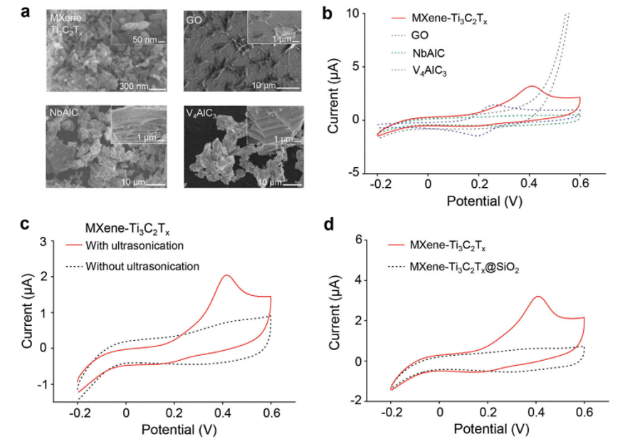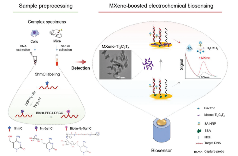 圖1. 5個hmC-DNA在復雜背景下的電化學檢測示意圖,包括樣品預處理和MXene增強的電化學檢測。