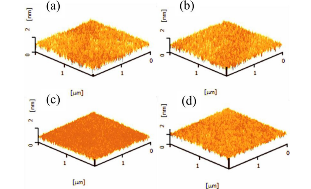 圖2. (a) GQDs-IGZO-0 薄膜、(b) GQDs-IGZO-1 薄膜、(c) GQDs-IGZO-2 薄膜和 (d) GQDs-IGZO-3 薄膜的 AFM 圖像。