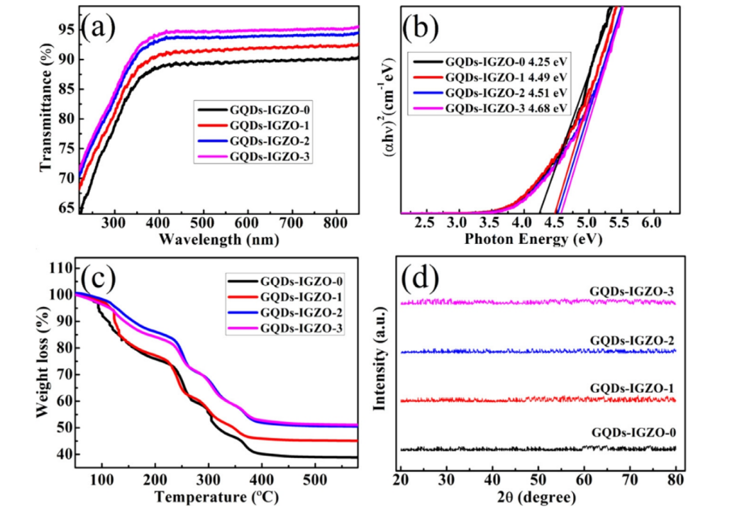 圖3. (a)透射率,(b)帶隙測定,(c)熱行為,(d)不同GQDs濃度下IGZO薄膜的XRD譜圖。