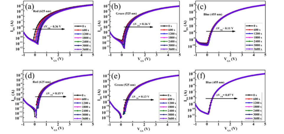 圖7. (a-c) GQDs-IGZO-0 TFT和(d-f) GQDs-IGZO-2 TFT在紅、綠、藍三種光照射下PBIS測試下的傳遞曲線。