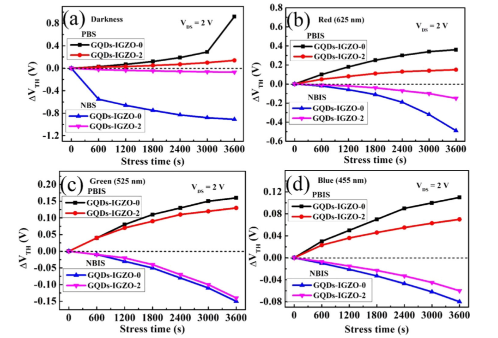 圖9. 在(a)黑暗、(b)紅光、(c)綠光和(d)藍光照射下,GQDs-IGZO TFT的V