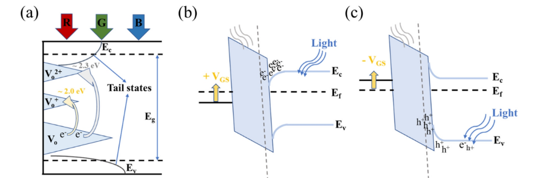 圖10. (a) GQDs-IGZO TFT中Vo相關阱態的光致電離示意圖。(b) PBIS和(c) NBIS在光照下柵電介質中固定電子的積累。