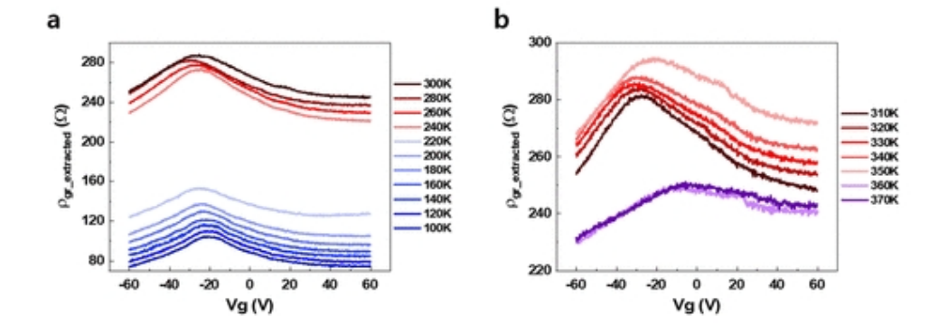 圖2:(a)與柵極相關(guān)的電阻率曲線,在升溫過程中溫度范圍從100到300 K。(b) 與柵極相關(guān)的電阻率曲線,在升溫過程中溫度范圍為310至370K。
