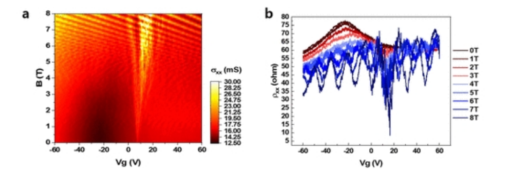 xx與60 mK下的柵極電壓和垂直磁場的二維圖。