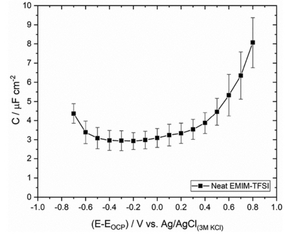 2鍵合的氫的1H NMR化學位移(見插圖),最小電容C通過對圖5中電容平臺電位區內的值(即-0.3至0.2V)取平均值來確定。水平藍色虛線顯示了從圖3所示數據中獲得的純EMIM-TFSI的C