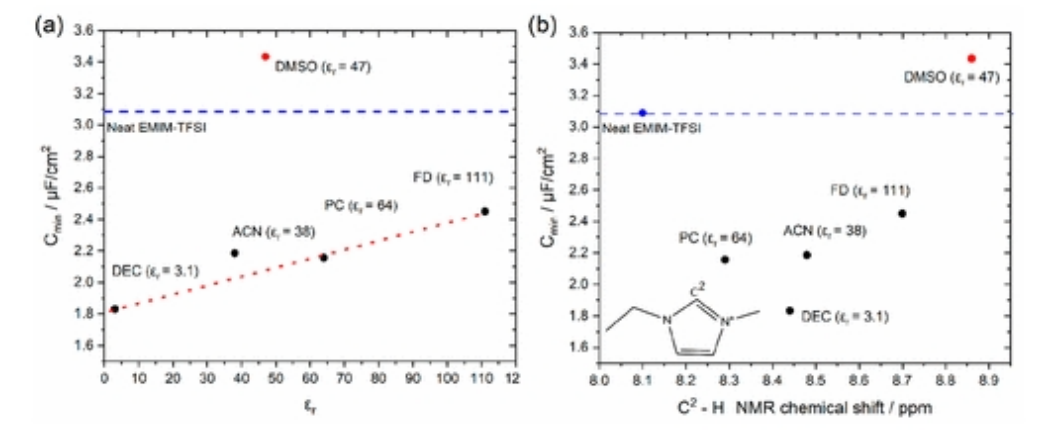 圖5.根據實驗部分中描述的實驗方案,在與EMIM-TFSI與(a)碳酸二乙酯(DEC,ε