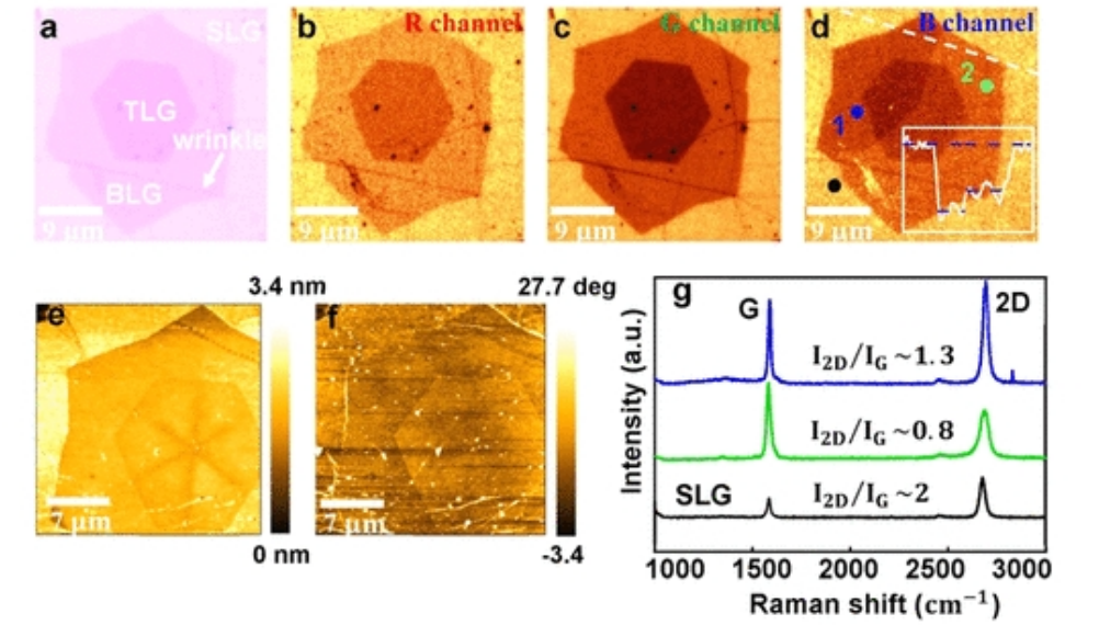 圖1. (a) 在SiO2/Si襯底上轉(zhuǎn)移的CVD生長的多層石墨烯的光學(xué)圖像。(b–d)R、G和b通道對應(yīng)于(a)中的光學(xué)圖像。(d)中的插圖顯示了白色虛線的反射強度分布。(e,f)(a)中相同石墨烯疇的AFM形貌圖像(e)和相位圖像(f)。(g) (d)中標記的色斑的拉曼光譜。