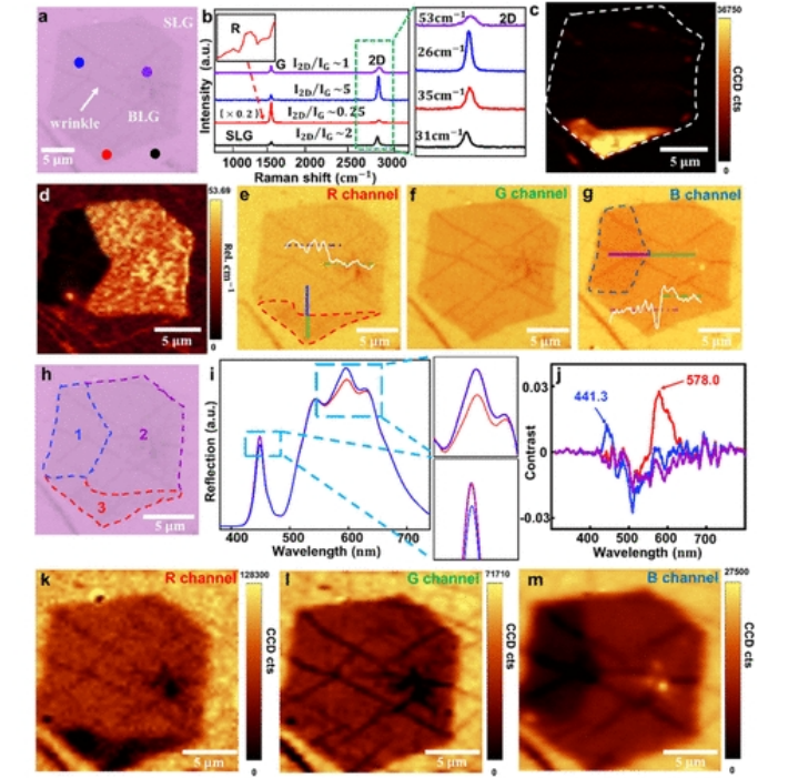 圖2. (a) 另一個雙層石墨烯結(jié)構(gòu)域的光學(xué)圖像。(b) 拉曼光譜對應(yīng)于(a)中標記的彩色點。(c,d)(a)中相同區(qū)域的G峰值強度(b)和2D峰值(c)的FWHM的拉曼圖。(e–g)(a)中光學(xué)圖像的R、g和B通道圖像。(h) 從拉曼光譜和圖譜中推斷出用紅色、藍色和紫色方框標記的不同扭曲區(qū)域。(i) WLRS對應(yīng)于三個扭曲區(qū)域。(j) 從反射光譜中獲得三個扭曲區(qū)域的吸收光譜。分別在R(560–800 nm)、G(450–600 nm)和B(350–540 nm)通道中進行的(k–m)WLRS映射。