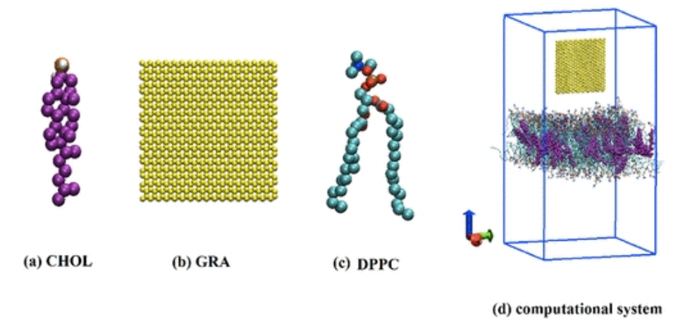 圖1.(a)膽固醇(CHOL)、(b)原始石墨烯納米片和(c)DPPC的分子模型。(d) 該計算系統由原始石墨烯納米片和水環境中含有DPPC脂質和膽固醇的膜組成。為了清楚起見,省略了水分子。石墨烯納米片最初以2nm的距離垂直放置在膜上方。
