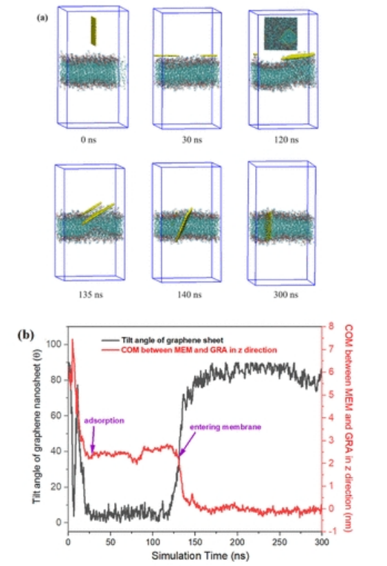 圖3. (a) 4×4nm石墨烯納米片和含20%膽固醇的DPPC膜之間的動態相互作用。(b) 在相互作用過程中,石墨烯納米片的傾斜角度以及石墨烯納米板和DPPC膜之間對應的COM的演變。