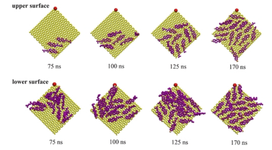 圖7. 植入過程中膽固醇在石墨烯納米片兩側的吸附快照。