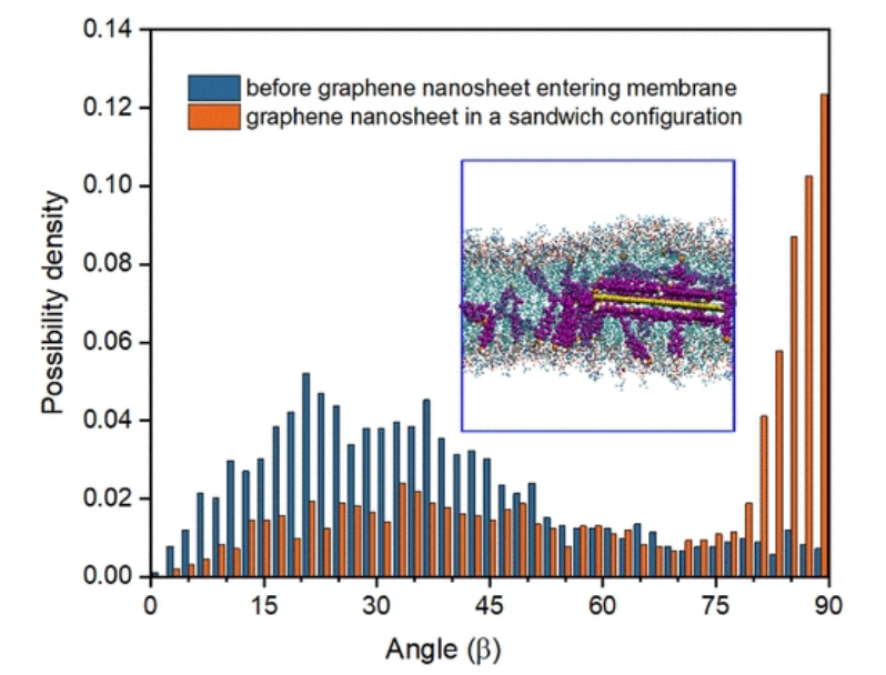 圖8. 在石墨烯納米片進入膜之前以及石墨烯與細胞膜形成夾層結構之后,膽固醇的角度分布。插入是膽固醇和具有夾層結構的石墨烯納米片的快照。