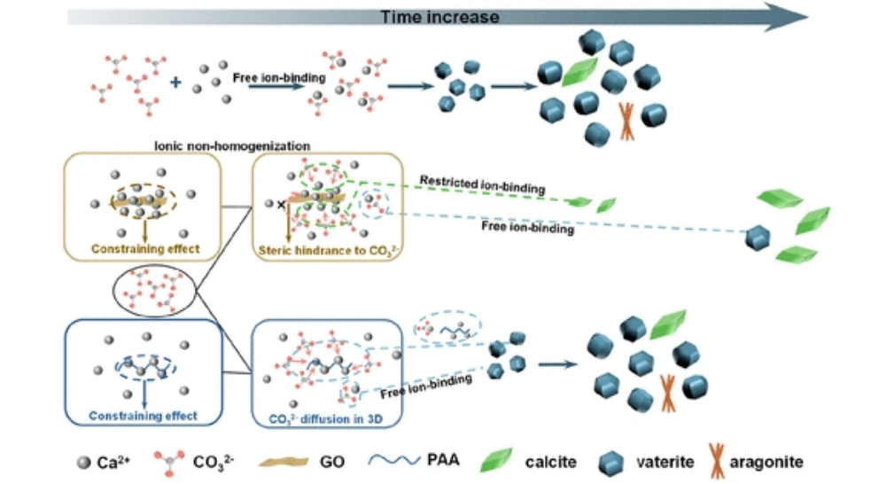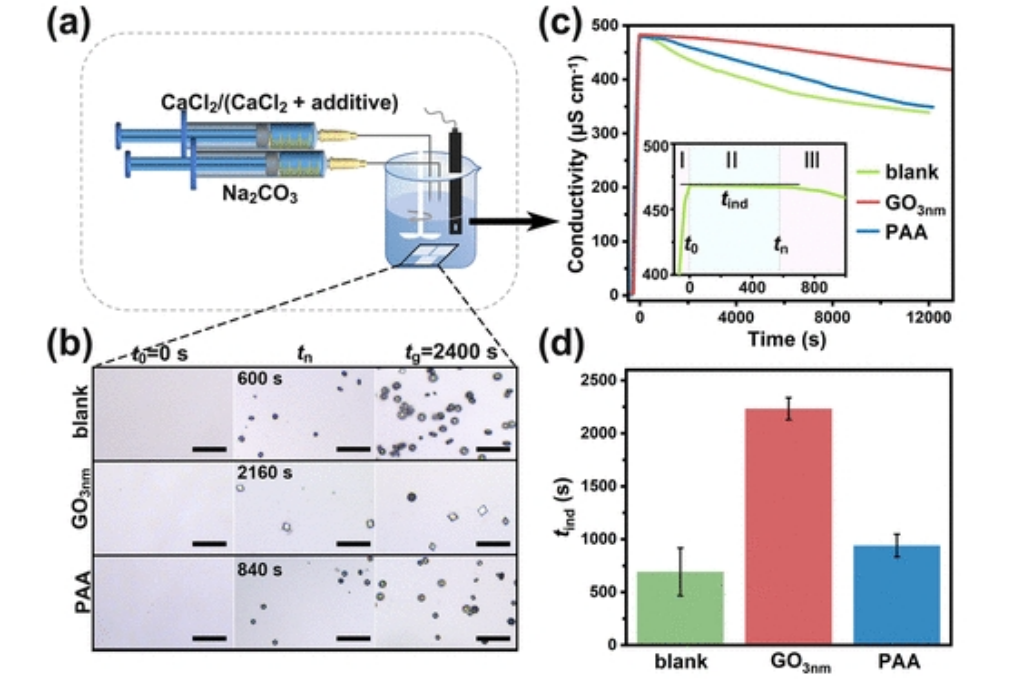 圖1. GO對碳酸鈣成核的影響。(a) 實驗裝置的示意圖。(b) 典型的光學顯微照片顯示了在不同階段在含有/不含有添加劑(GO