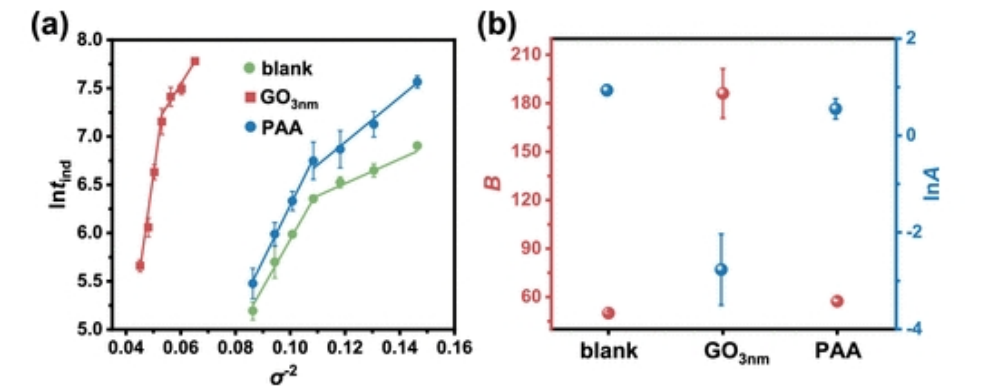圖5. 不同氧化程度和大小GOs的碳酸鈣成核抑制性能。含有(a)不同氧化程度的固定尺寸GOs和(b)三種不同濃度的不同尺寸GOs的溶液體系中碳酸鈣的t