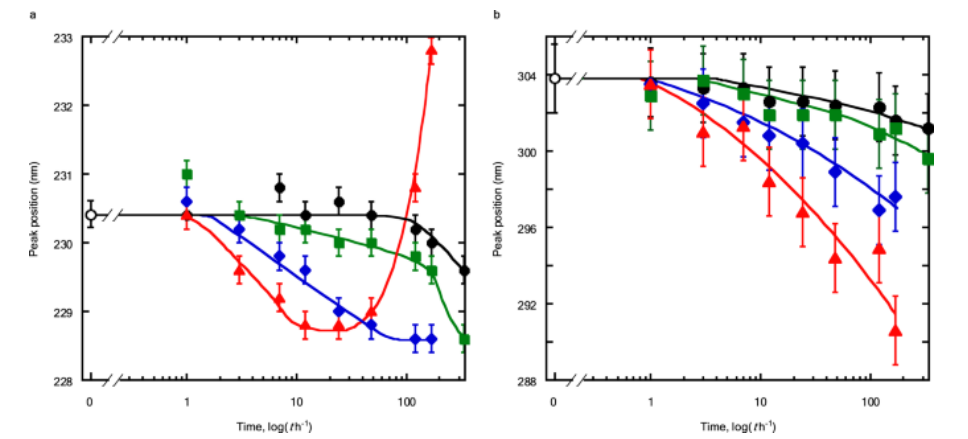 Fig 2. 峰位置隨成熟時(shí)間的變化。 aπ-π* 躍遷。b n-π* 躍遷。橫軸是對(duì)數(shù)刻度。成熟溫度:黑色實(shí)線和圓圈,298 K;綠色實(shí)線和方塊,308 K;藍(lán)色實(shí)線和鉆石,333 K;紅色實(shí)線和三角形,348 K。空心圓圈表示 GO 膠體在成熟前的峰值位置。誤差線代表至少三個(gè)測(cè)量的峰位置確定的再現(xiàn)性。