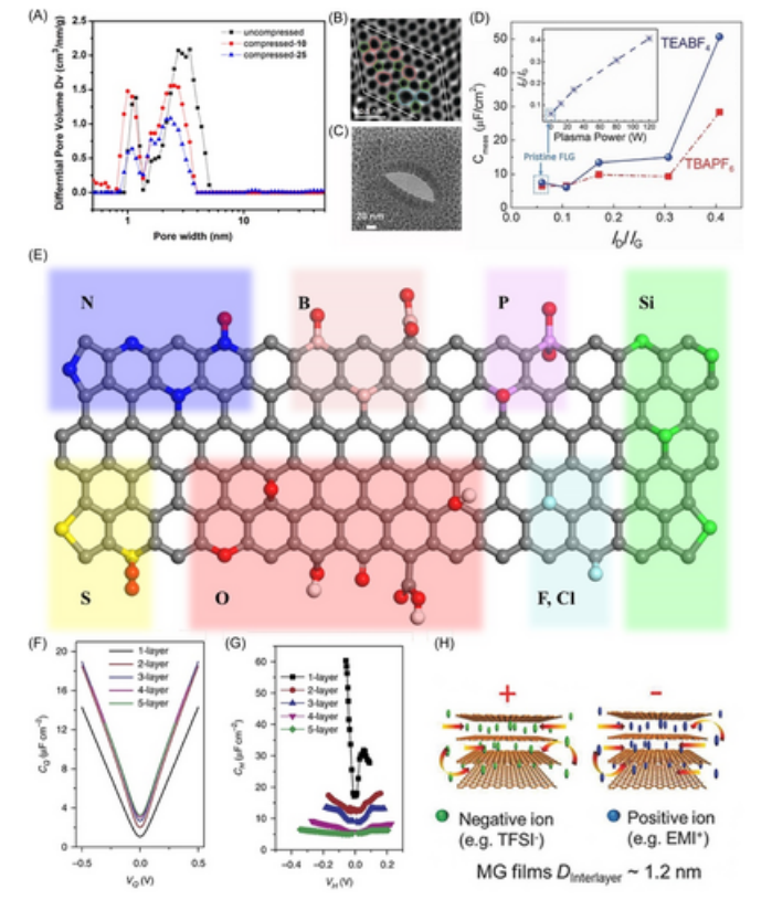 Fig 1. (A) 使用狹縫/圓柱非局域密度泛函理論模型通過 N2 吸附測量微波剝離氧化石墨烯(壓縮力為 10 噸或 25 噸)的未壓縮和壓縮活化的孔徑分布。通過透射電子顯微鏡觀察到(B)單層石墨烯的拓撲缺陷和(C)Ar+等離子體處理引起的少層石墨烯(FLG)的擴展孔隙。 (D) FLG 中拉曼光譜的 D 峰和 G 峰強度比 (ID/IG) 與比電容之間的關系。插圖顯示 ID/IG 隨著等離子體功率的增加而增加。 (E) 石墨烯中的雜原子摻雜。 (F) 量子電容和 (G) 6 M KOH 水溶液中的亥姆霍茲電容與電壓的關系,具體取決于多層石墨烯 (MLG) 的層數。 (H) MLG中離子嵌入的示意圖。