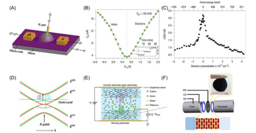 Fig 2. (A) IL 門控石墨烯裝置。 (B) 通過源極和漏極的電流由 PEO/LiClO4 電解質中的柵極電壓調制。 (C) PEO/LiClO4 電解質中石墨烯的 2D 與 G 拉曼峰強度之比。 (D) 基于緊束縛模型計算的雙層石墨烯在施加垂直電場之前(紅色)和之后(綠色)的能帶結構。(E) IL門控石墨烯膜在KCl水溶液中的示意圖。 (F) rGO膜在1.0 M KCl水溶液中的實時滲透監測裝置。