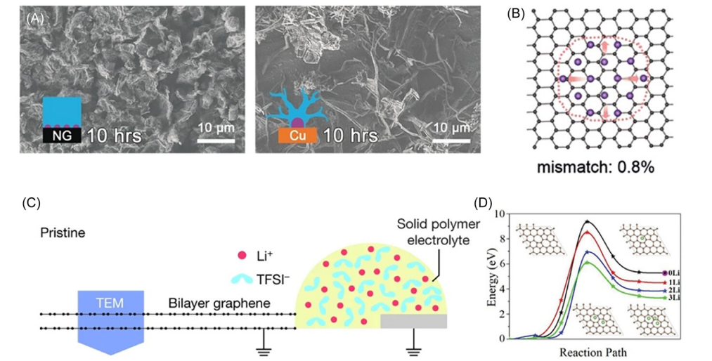 Fig5. (A) 0.50 mAh cm−2 鍍鋰后氮摻雜石墨烯電極和銅箔電極的掃描電子顯微鏡圖像。 (B)Li(110)面與石墨烯晶格失配的石墨烯上Li存儲示意圖。(C) 雙層石墨烯中存儲 Li+ 的原位透射電子顯微鏡裝置的側視圖。 (D) 不同吸附鋰原子數的Stone-Wales缺陷的反應路徑和形成能。