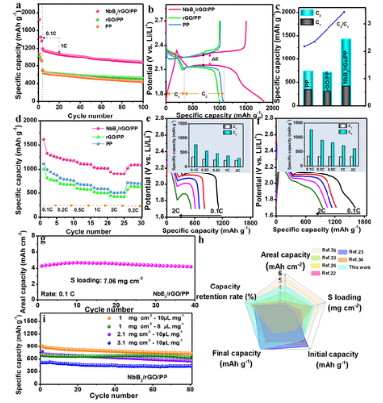 Fig 2. PP和NbB2/rGO的(a)循環(huán)性能,(b)充放電曲線,(c)C1和C2階段相應(yīng)的放電容量,(b),(d)倍率容量,(e,f)放電曲線在不同倍率下,(g)高負載情況下正極的循環(huán)性能,(h)與之前的報告比較,以及(i)低電解質(zhì)使用情況下的循環(huán)性能。插圖為PP和NbB2/rGO不同階段容量貢獻率圖。