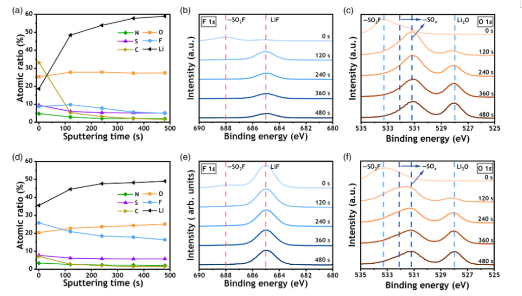 圖4. 在 Cu/Li 和 S-Ti3C2Tx@Cu/Li 不對(duì)稱電池中,在 0.5mAcm−2 條件下鍍 4 mAh cm−2 鋰后,通過(guò) XPS 測(cè)量獲得 SEI 信息。 不同濺射時(shí)間下 a) Cu 集流體和 d) S-Ti3C2Tx@Cu 集流體上鋰金屬表面 SEI 的量化原子組成比。 不同濺射時(shí)間下 b) Cu 集流體和 e) S-Ti3C2Tx@Cu 集流體上鋰金屬表面的 F 1s XPS 深度剖面。 c) Cu集流體和f) S-Ti3C2Tx@Cu集流體在不同濺射時(shí)間下的O 1s XPS深度剖面圖。