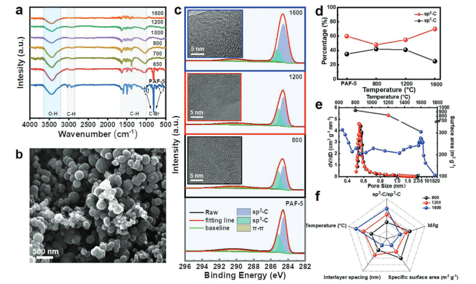 圖2. PAF-5衍生碳的結構演化與表征。a) PAF-5在不同溫度下熱解后的原位FTIR光譜。b) 1200碳的典型SEM圖像。c) PAF-5及其衍生碳的XPS c1s光譜,以及相應的TEM圖像(插圖)。D) sp2/sp3比值隨熱解溫度的變化規律。e)衍生碳的SSA和孔徑分布隨熱解溫度的變化規律。f)典型碳的內在特征相關性。