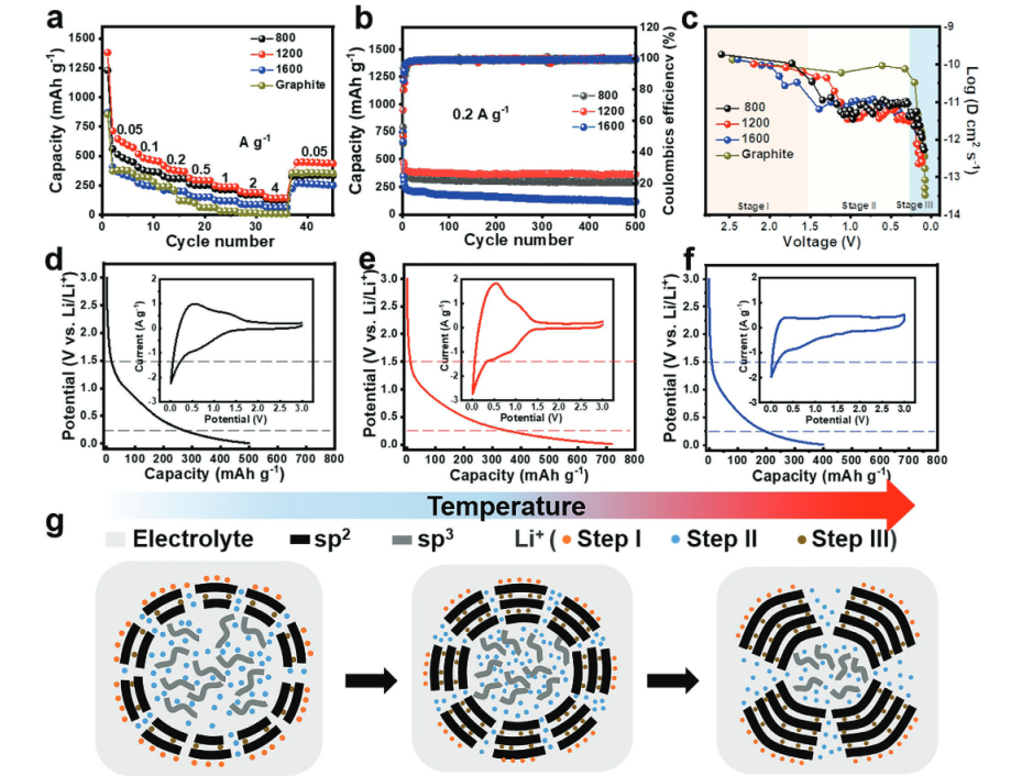 圖3. PAF-5衍生炭在半電池中的鋰離子儲存性能。a)與商業石墨陽極相比的速率性能。B)循環性能。c)鋰離子擴散系數(DLi +)作為放電過程中典型電壓點的函數。d-f)碳陽極的典型 CV 和 GCD 曲線。g)隨著裂解溫度的升高,碳結構演變和鋰離子儲存機理的示意圖。