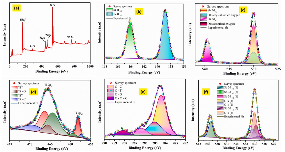 圖3. BSO/GF/MX 納米復合材料的 XPS 測量光譜 (a); Bi 4f (b) 的解卷積光譜; Sb 3d (c) 的解卷積光譜; Ti 2p (d) 的解卷積光譜; C 1s (e) 的解卷積光譜和 O 1s (f) 的解卷積光譜。