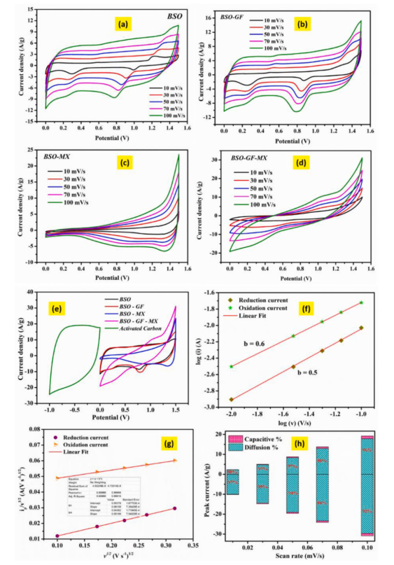 圖4. CV 圖:(a) BSO、(b) BSO–GF、(c) BSO–MX 和 (d) BSO–GF–MX 電極和 (e) log (i) Vs log (v) 的線性擬合圖; (b) 電極 BSO-GF-MX 之間和之間的圖。