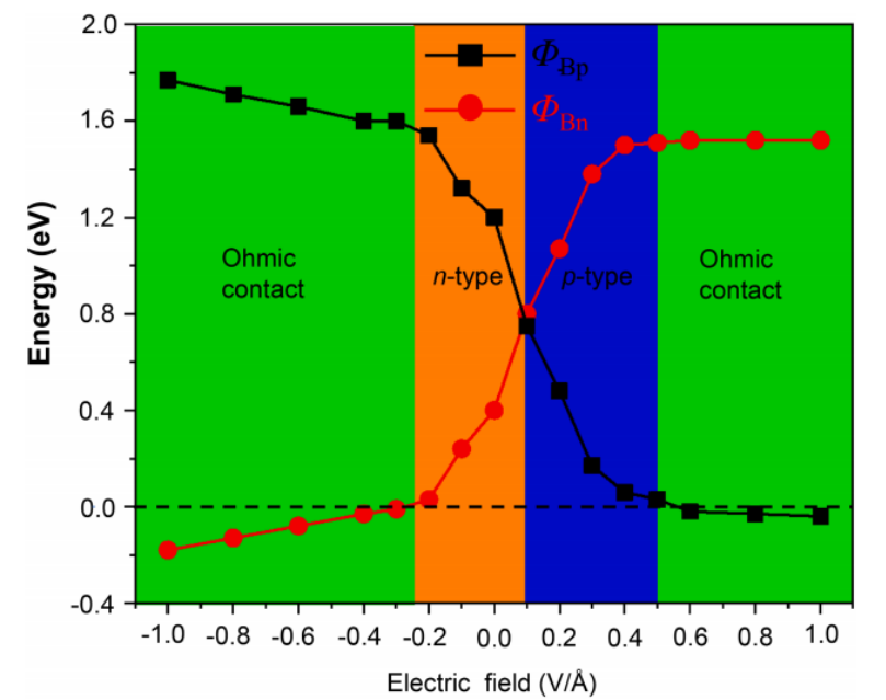 Eext =-0.3 V/Å和0.6 V/Å時,接觸分別變為n型和p型歐姆接觸。這些發現表明,石墨烯/WGe