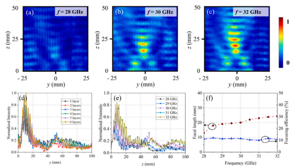 圖7. 測量(a) 28-GHz、(b) 30-GHz和(c) 32-GHz波照射的三層石墨烯透鏡的電場分布。(d)當x=y= 0時,由1 ~6層石墨烯構成的菲涅耳透鏡傳輸的30 GHz平面波電場對y的依賴性;( e )三層石墨烯透鏡傳輸的不同頻率波對z的依賴性;( f )三層石墨烯透鏡的焦距和聚焦效率與工作頻率的關系。