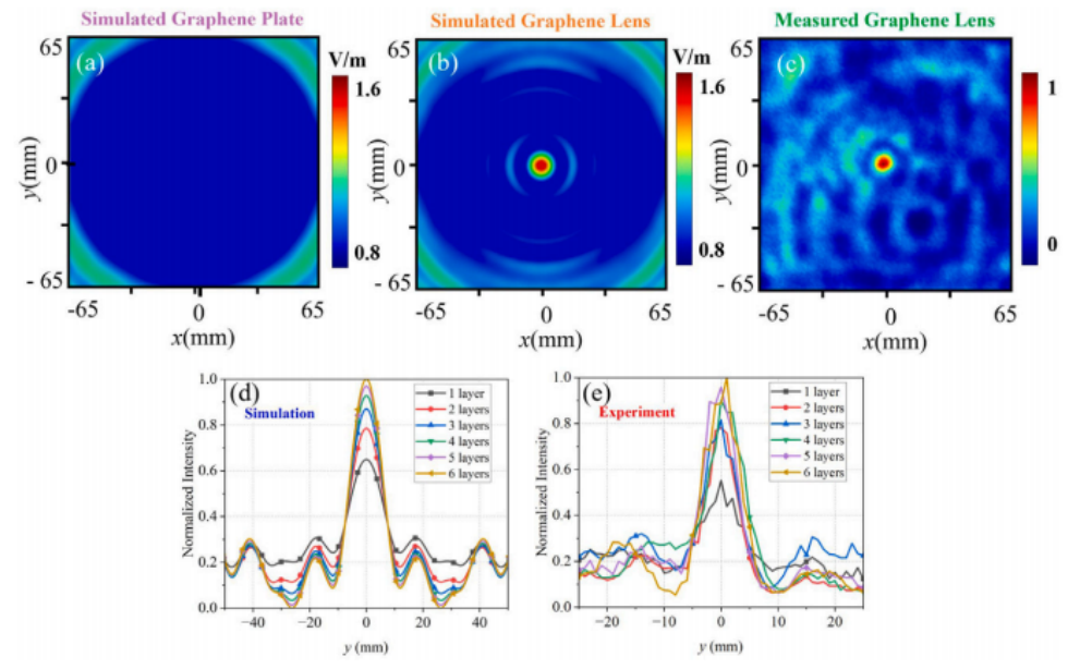 超薄菲涅耳透鏡的發(fā)展使透鏡技術發(fā)生了革命性的變化,為電磁系統(tǒng)的小型化提供了巨大的前景。盡管在微觀技術方面取得了相當大的進展,但實現超低剖面微波透鏡的可擴展制造策略仍有待開發(fā)。在這里,我們報道了一種利用石墨烯環(huán)制造超薄和基本平坦的菲涅耳透鏡的新策略。結果表明,利用石墨烯獨特的傳輸特性單層或多層石墨烯可以微結構化成菲涅耳透鏡。我們設計了不同的菲涅耳透鏡,并通過數值和實驗研究了它們在微波狀態(tài)下的性能。結果表明通過改變石墨烯的層數,可以在不改變聚焦點的情況下改變聚焦波的強度。我們的實驗結果與數值模擬的結果之間的良好一致性證明了原子厚度(工作波長約為10
