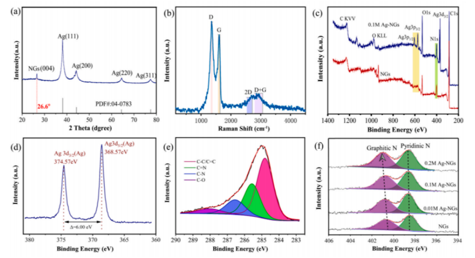 圖3. Ag - NGs納米復合材料的晶體結構、組分和價鍵表征。(a)XRD模式;(b)拉曼光譜;(c)XPS光譜;(d)高分辨率Ag3d圖譜;(e)高分辨率C1s圖譜;(f)高分辨率N1s圖譜。