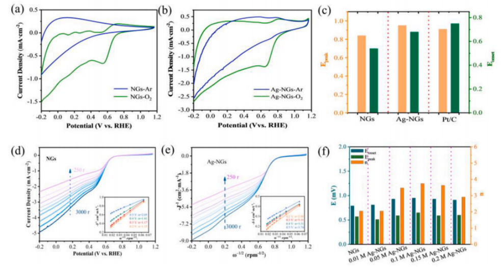 -1)中,以不同轉速( 250 - 3000轉/分)記錄ORR的線性掃描伏安曲線(LSVs),插圖是背景校正后NGs和Ag - NGs的相應K-L圖;(f)不同Ag濃度下Ag - NGs復合物的E
