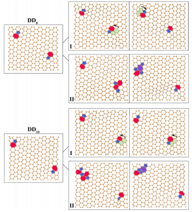 圖5. 位錯偶極子DD8、DD10及其主要的動態事件類型。五原子環為藍色,八原子環為紫色,七原子環為紅色。DD之前的位置用綠色的六原子環表示。黑色箭頭表示位錯的運動方向。