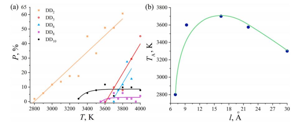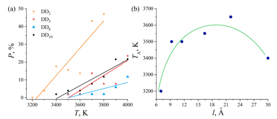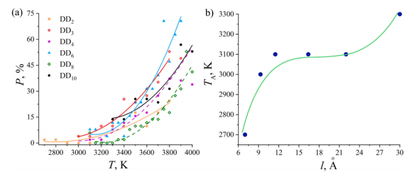 圖8. (a)對于DD2,DD3,DD6,DD8和DD10的代表性樣品,SW缺陷形成的概率P與溫度的函數。符號表示數值型數據,實線表示逼近曲線。(b)SW缺陷形成開始的溫度與偶極臂的函數。