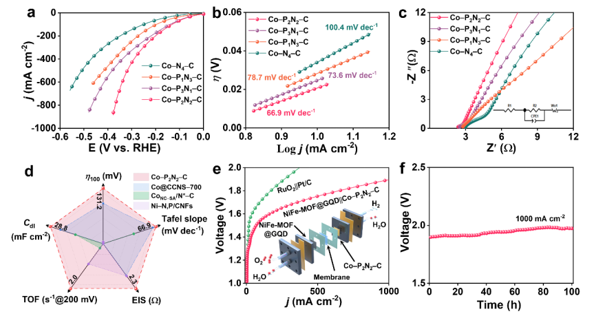 碳基過渡金屬單原子催化劑的合理設計需要單原子催化劑內雜原子的精確排列。然而,由于熱解過程中結構會坍塌,實現這種設計具有挑戰性。在這里,作者引入了拓撲雜原子轉移策略,以防止結構坍塌并精確控制碳基單原子催化劑中的P配位。作者利用石墨烯量子點制備了具有空腔結構的自組裝螺旋纖維,在這些空腔內,可調節的官能團可以螯合金屬離子(Nx…Mn+…Oy),從而在基于熱解的磷化過程中促進結構的保存。該過程允許雜原子從組裝體轉移到單原子催化劑中,從而實現精確的配位調整。值得注意的是,Co-P2N2-C催化劑表現出優異的堿性析氫電催化性能,電流密度為100 mA cm−2時,過電位僅為131 mV。