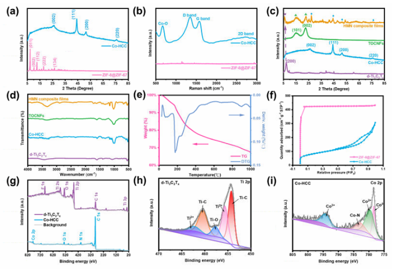 圖3. HMN復合薄膜的晶體結構和組成。 a 分別是ZIF-8@ZIF67熱解前后的XRD圖譜和b拉曼圖譜。分別為 HMN 復合薄膜、TOCNF、Co-HCC 和 d-Ti3C2TX 的 c XRD 圖案和 d FTIR 光譜。 HMN 復合薄膜的 TG 和 DTG 分析。 f ZIF-8@ZIF-67 和 Co-HCC 的氮氣吸附-解吸等溫線。g d-Ti3C2TX 和 Co-HCC 的 XPS 全譜。 d-Ti3C2TX 的 h Ti 2p 和 Co-HCC 的 i Co 2p 的 XPS 精細光譜。