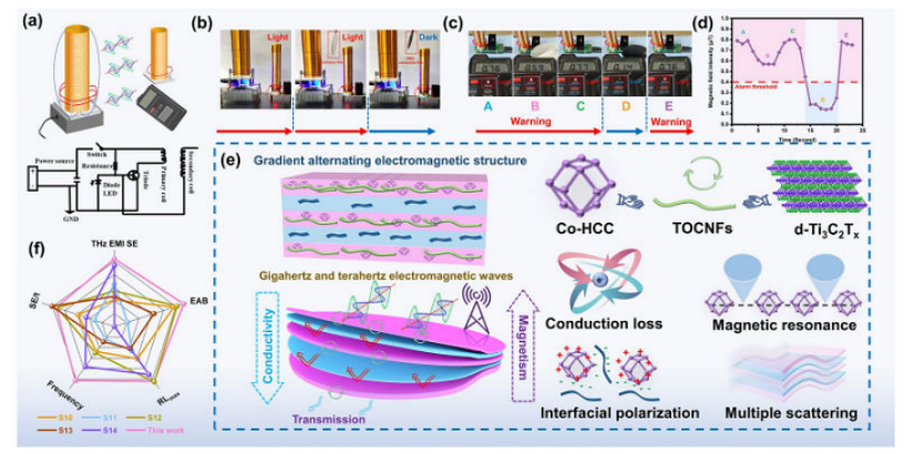 隨著通信技術的不斷進步,對具有多功能、寬帶EMI性能的電磁屏蔽干擾(EMI)材料的需求日益迫切。控制電氣和磁性元件以及設計 EMI 材料結構引起了廣泛的興趣,但仍然是一個巨大的挑戰。在此,我們報道了通過交替真空輔助過濾過程由中空金屬有機框架/層狀MXene/納米纖維素(HMN)組成的交替電磁結構復合薄膜。 HMN復合薄膜在GHz頻率(Kaband時為66.8 dB)和THz頻率(0.1-4.0 THz時為114.6 dB)表現出優異的EMI屏蔽性能。此外,HMN復合薄膜在0.7 THz處還表現出39.7 dB的高反射損耗,有效吸收帶寬高達2.1 THz。此外,HMN復合薄膜表現出卓越的光熱轉換性能,在2.0 Sun下可達到104.6 °C,在0.8 W cm−2下可達到235.4 °C。獨特的微觀和宏觀結構設計結構將通過界面偏振/多重散射吸收更多的入射電磁波,并通過局部表面等離子體共振效應產生更多的熱能。這些特性使 HMN 復合薄膜成為未來 6G 通信和寒冷環境中電子設備保護的先進 EMI 器件的有前途的候選者。