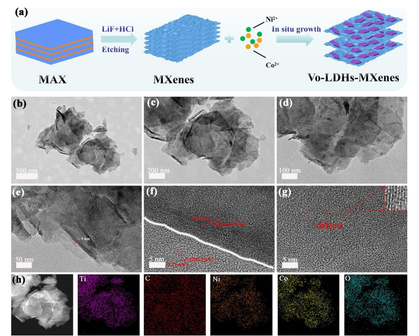 圖1.(a)制備路線示意圖,(b)∼(e)TEM,(f)∼(g)HRTEM圖像和(h)HAADF-STEM圖像以及Vo-LDHs-的相關元素映射MXene。